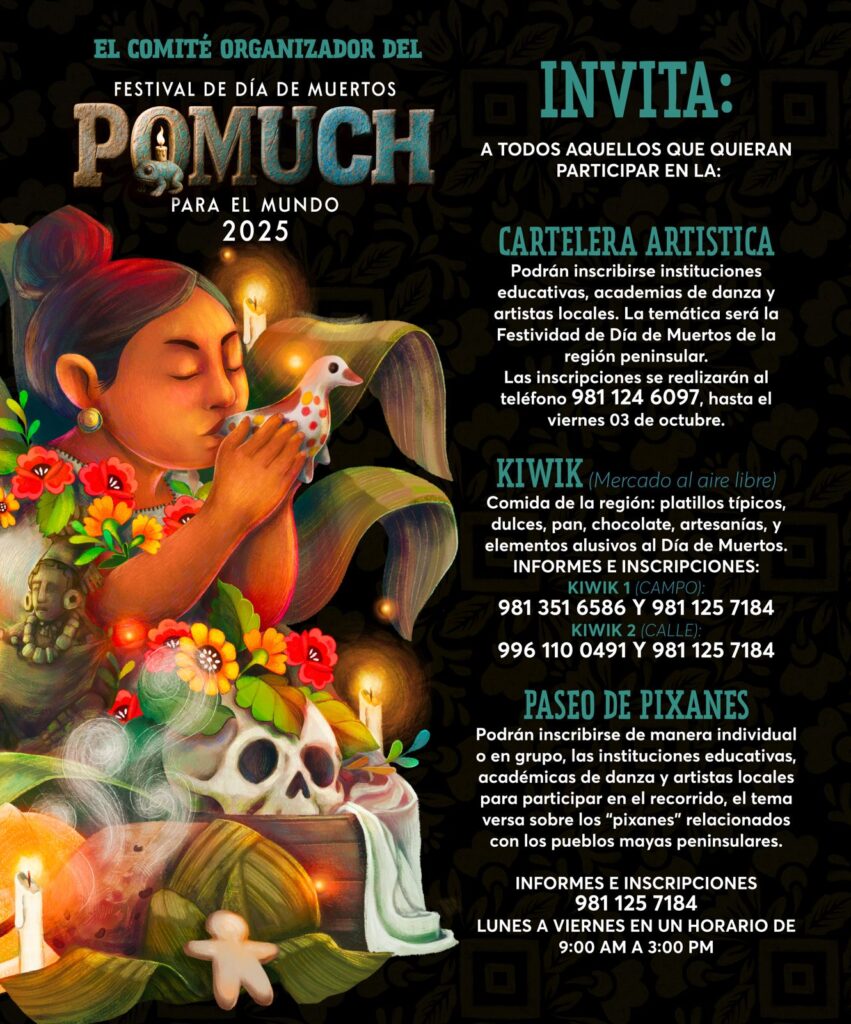 Asimismo, se convocó a instituciones educativas, academias de danza y artistas locales para integrarse a la Cartelera Artística, con fecha límite de inscripción hasta el viernes 3 de octubre, mediante el número 981 124 6097. También se extendió la invitación a emprendedores, artesanos y productores locales para participar en el “Kiwik”, mercado al aire libre que fomenta el consumo local y la proyección del talento campechano, a través de los teléfonos 981 351 6586 y 981 125 7184.
